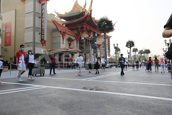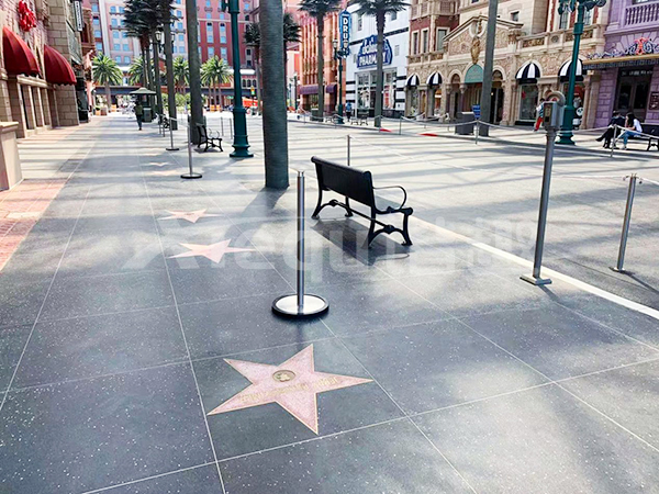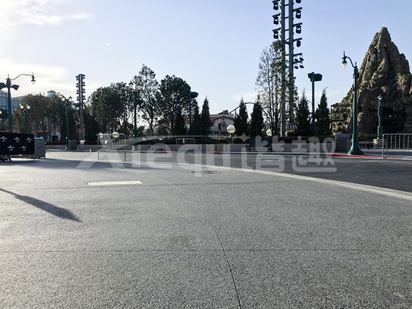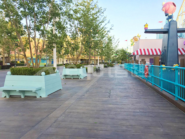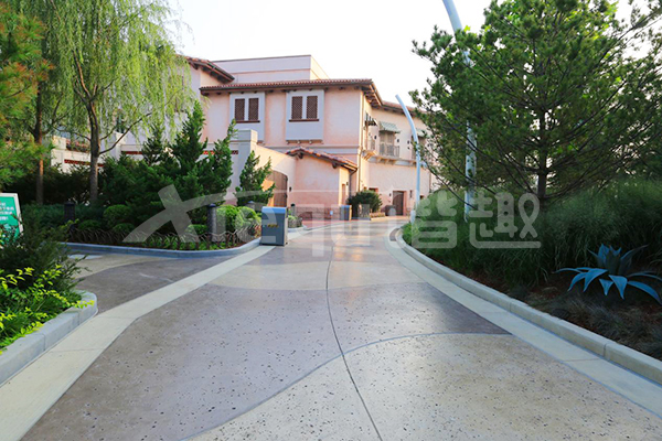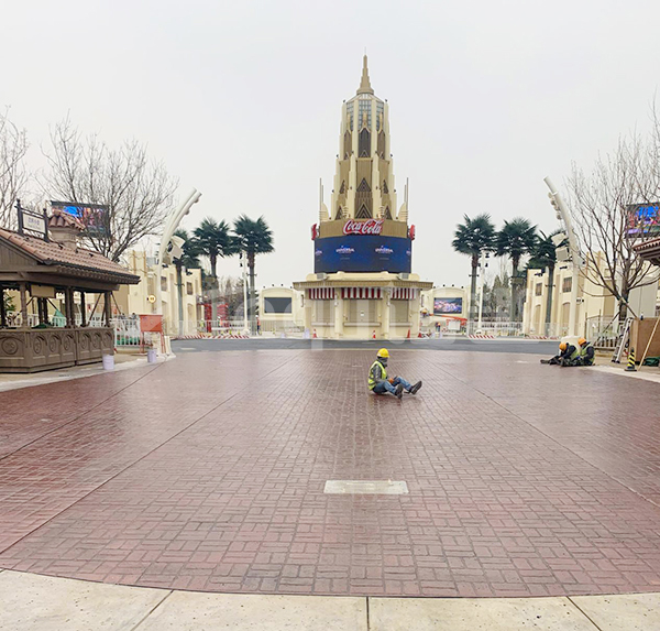 我司參與了北京環(huán)球影城好萊塢大道和小黃人兩個主題的路面鋪裝工作,鋪裝面積為2.4萬㎡。其中包含了彩色混凝土礫石面藝術地坪、彩色混凝土壓印藝術地坪、彩色混凝土洗砂面藝術地坪、彩色混凝土鹽巖面藝術地坪、彩色混凝土仿泥仿塵藝術地坪、整體現(xiàn)澆路牙、掃毛面、座椅墻、化學著色等鋪裝硬景。
