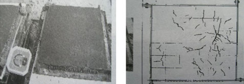 左圖:同一環(huán)境中不同保濕條件下的試件; 右圖:未覆蓋的試件裂縫開展情況(實(shí)測描繪)