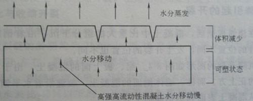 如果混凝土溫度比氣溫高(因陽光暴曬或其它原因,比如攪拌車到現(xiàn)場后,混凝土長時(shí)間不能澆灌入模,水化已經(jīng)開始),即使氣溫涼爽且相對濕度為100%的飽和條件下,水分從混凝土表面蒸發(fā)的速率也相當(dāng)可觀,因此,在涼爽、潮濕的氣候下混凝土也可能出現(xiàn)塑性裂縫。