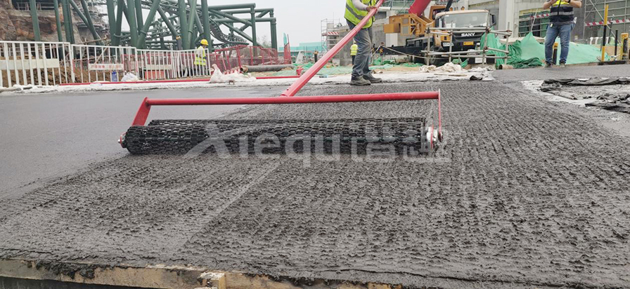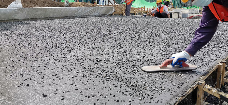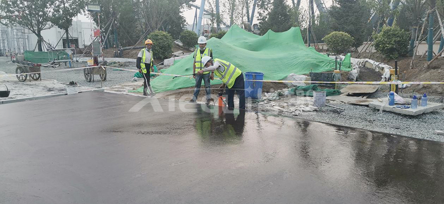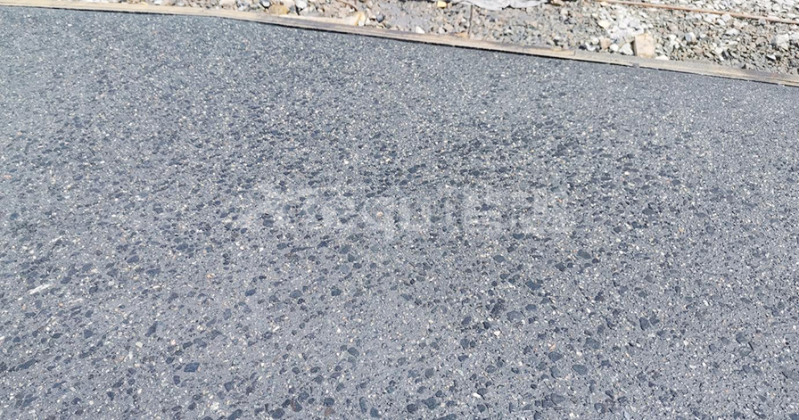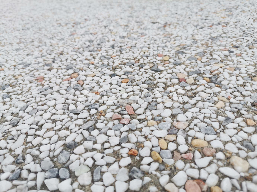 礫石聚合物藝術(shù)地面是在通體彩色混凝土初凝前合適的時機按照一定的比例要求將特殊骨料均勻的拋灑于彩混面層,再將骨料拍入面層后進行收光,最后在面層均勻噴灑鈍化劑薄膜覆蓋,待混凝土固化到一定程度對表面進行清洗露出骨料原貌的一種裝飾做法。